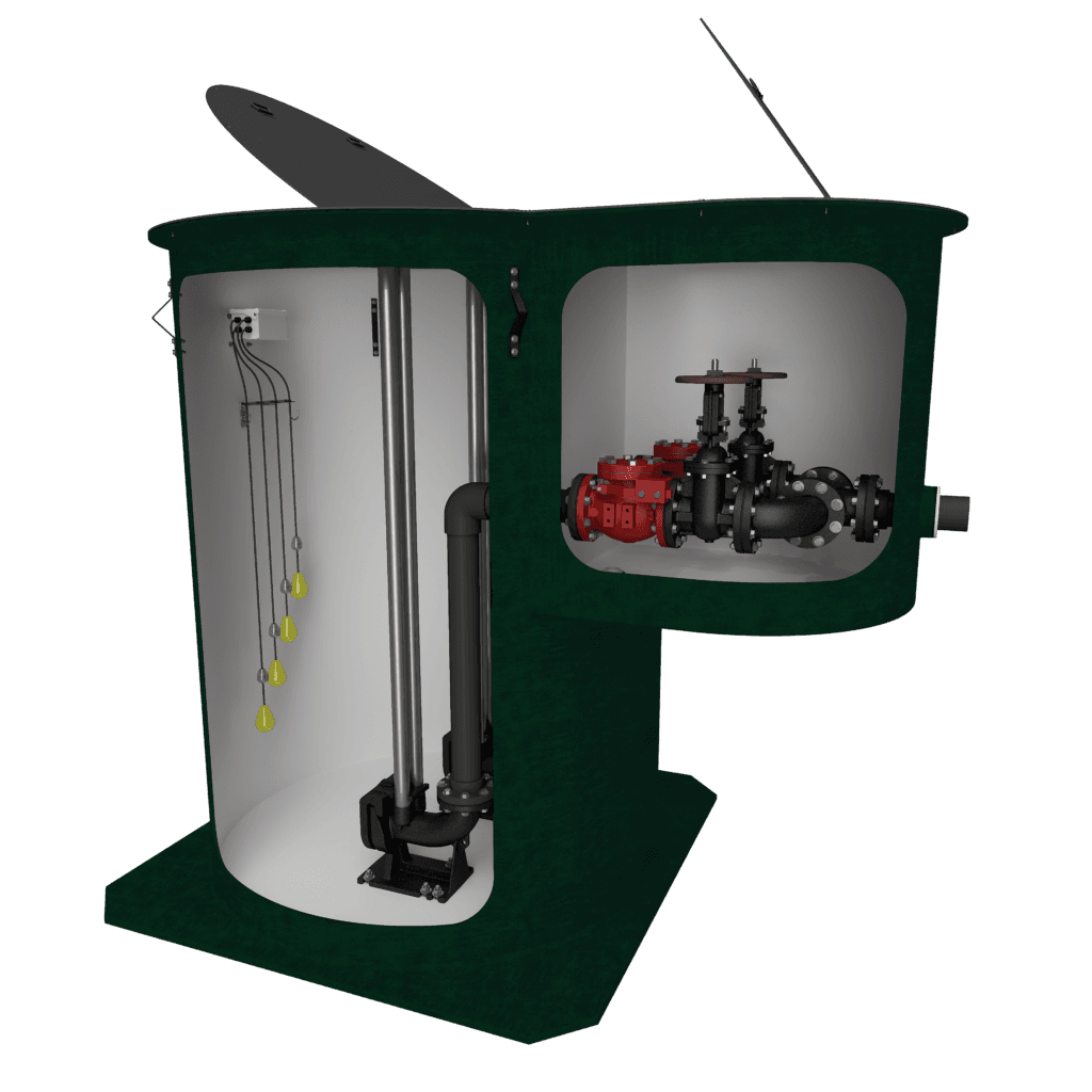 The integral valve box shall be constructed of fiberglass with dimensions varying based on pipe size and pump application. Valve boxes are available in square and D-shaped configurations for specific applications. Contact the AK Sales Team to determine the best fit for your needs.
